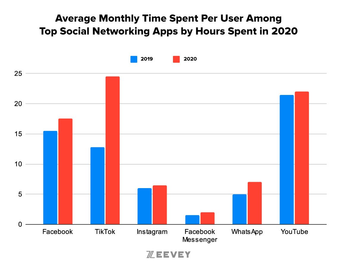 In 2019, Facebook users spent an average of 15.5 hours per month on its app, while TikTok users spent an average of 12.8 hours per month. By 2020, TikTok’s engagement had nearly doubled: its users spent an average of 21.5 hours per month. Facebook’s average time per user had grown by just two hours over the same time period.