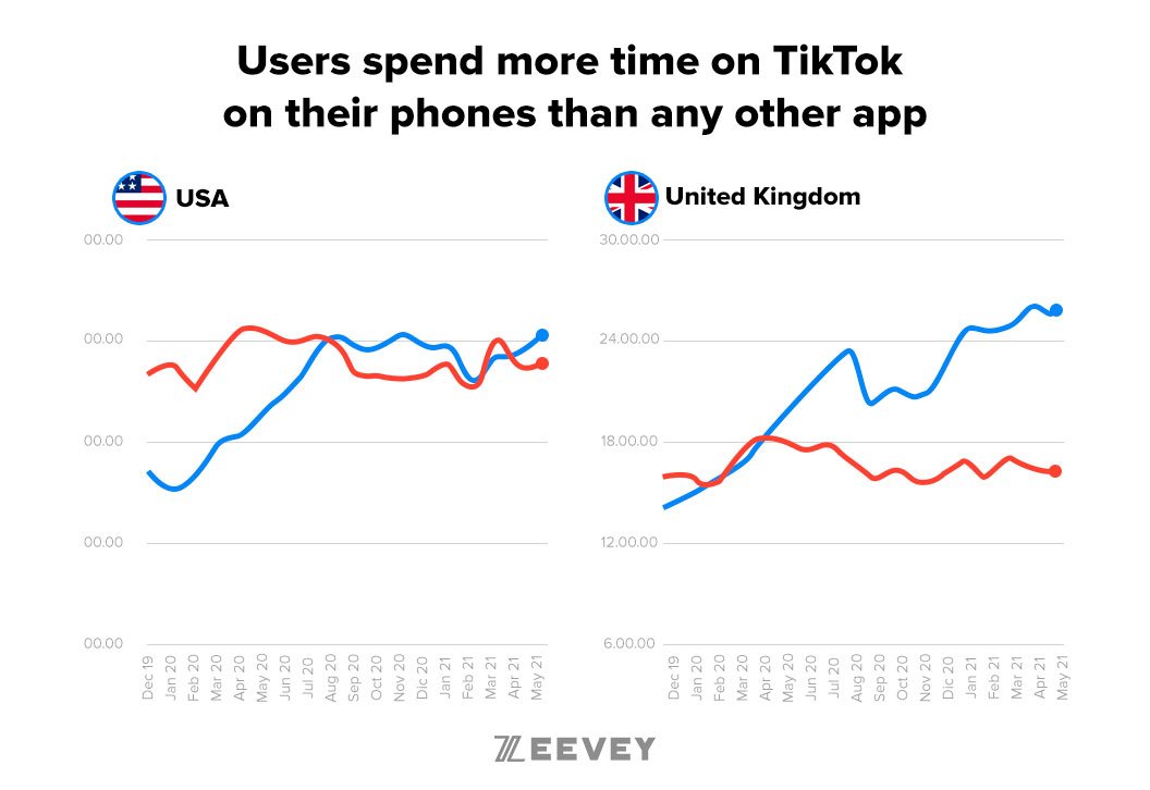 TikTok also leads YouTube in the UK, where users spend about 26 hours a month on TikTok and about 16 on YouTube.